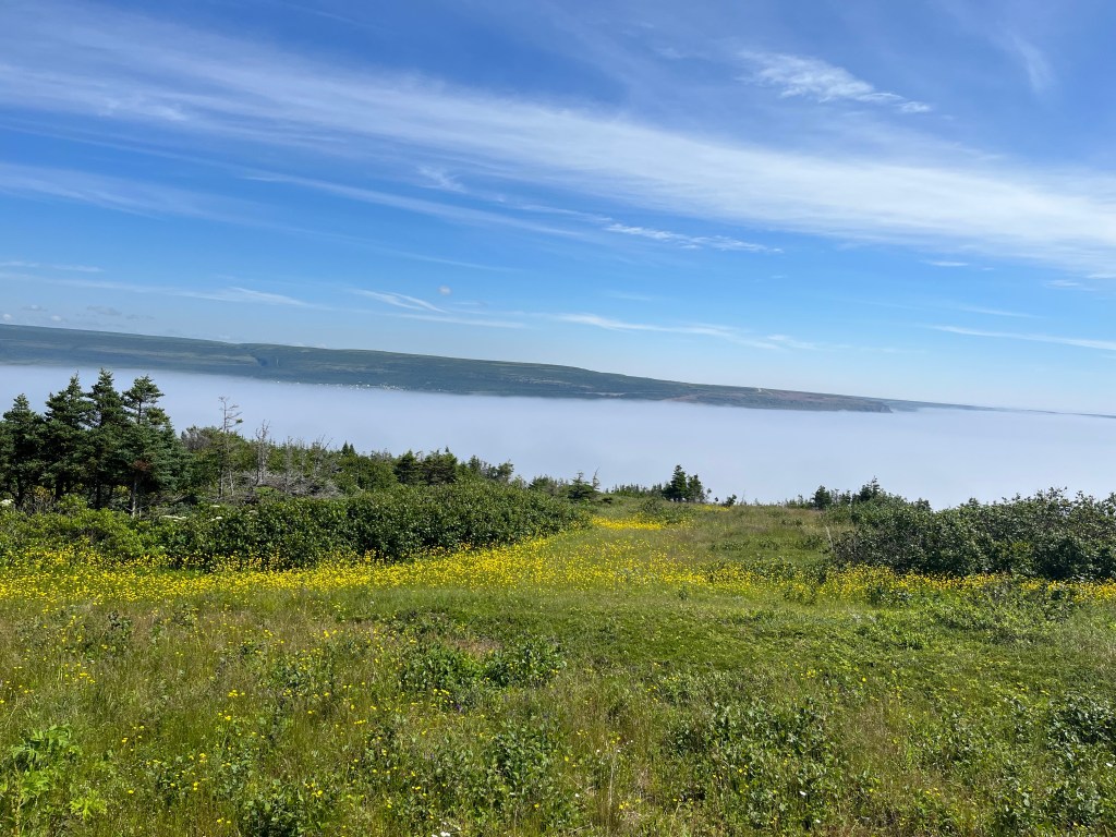 7. Bof quitte Happy Valley / Goose Bay ce matin. Mais Bof, qu’en est-il de ton tour de bateau de six jours sur la côte nord du Labrador ? Projet abandonné. Notamment car il n’y a pas de camping ici. Il me faudrait attendre quatre nuits sans douche … et à rien faire.6. (Photo d’hier) Une épaisse brume couvre la baie et ne laisse poindre que quelques maisons du village d’English Point. Ce matin, tout le niveau de la mer du sud du Labrador est couvert d’un vaste, et dense, brouillard. De sommets en vallées, j’alterne plongées dans la purée de pois puis émersions au soleil.