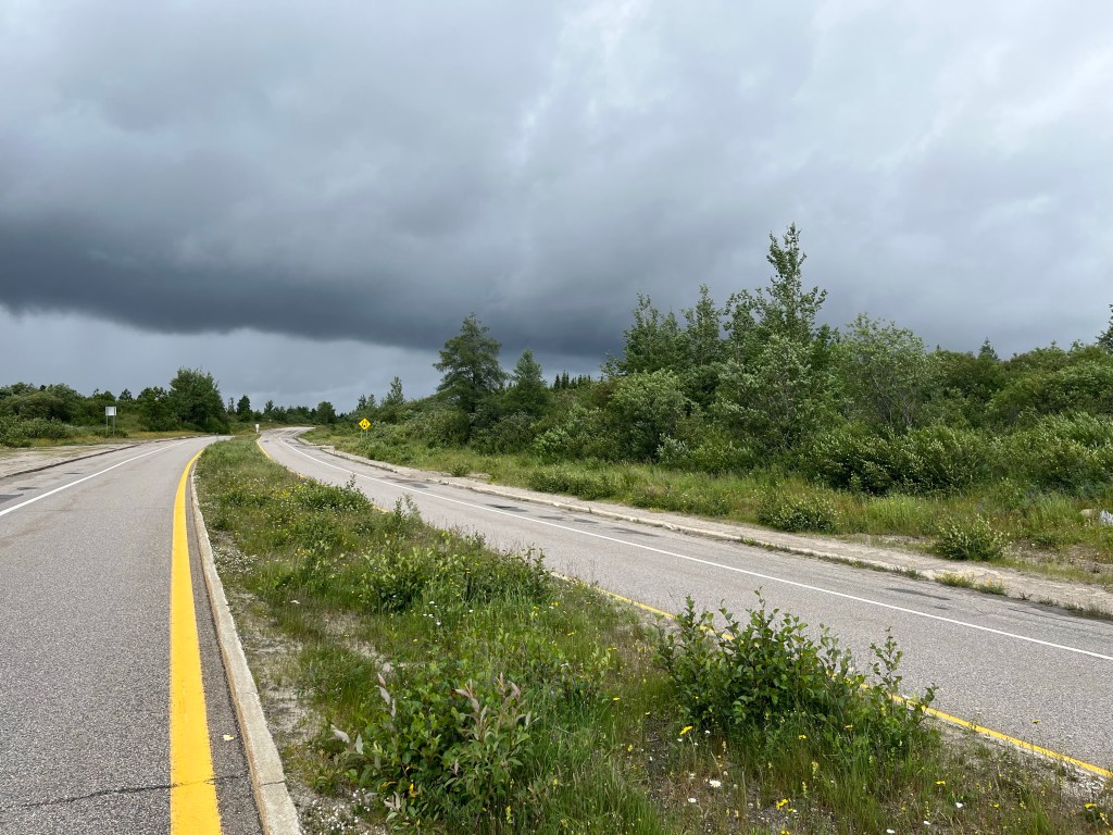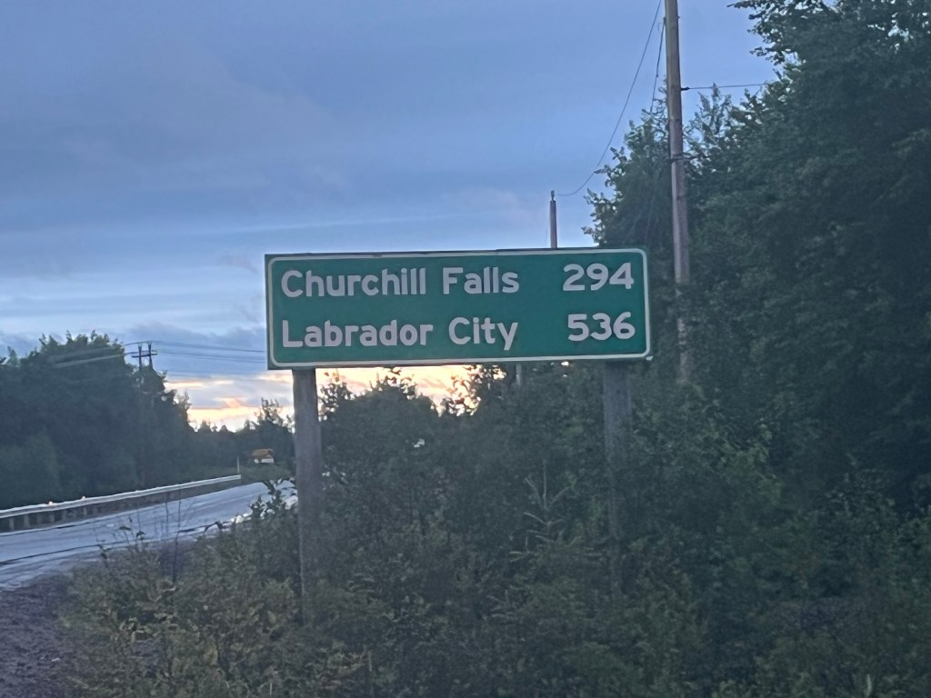 13. Un cycliste croisé au Km 110. Peu de bagages. Donc pas de camping. Ça veut dire qu’il fait Labrador City / Churchill Falls dans la journée (250 km). Puis (le lendemain ?) fera les 288 km jusqu’à Happy Valley. Respect.