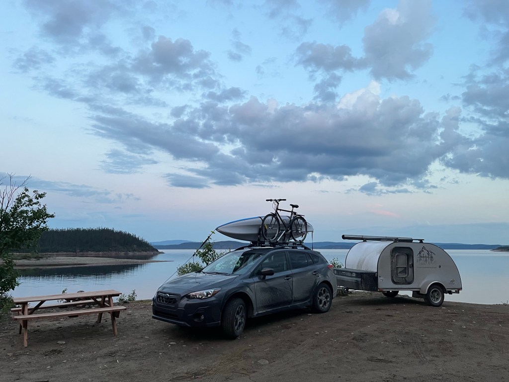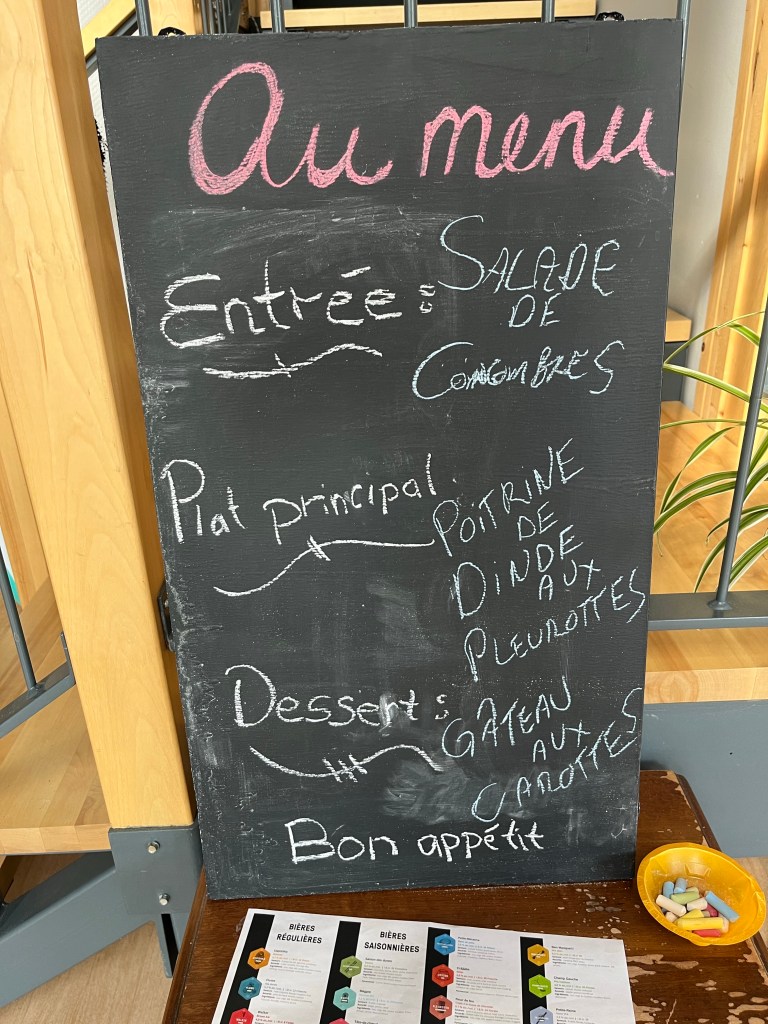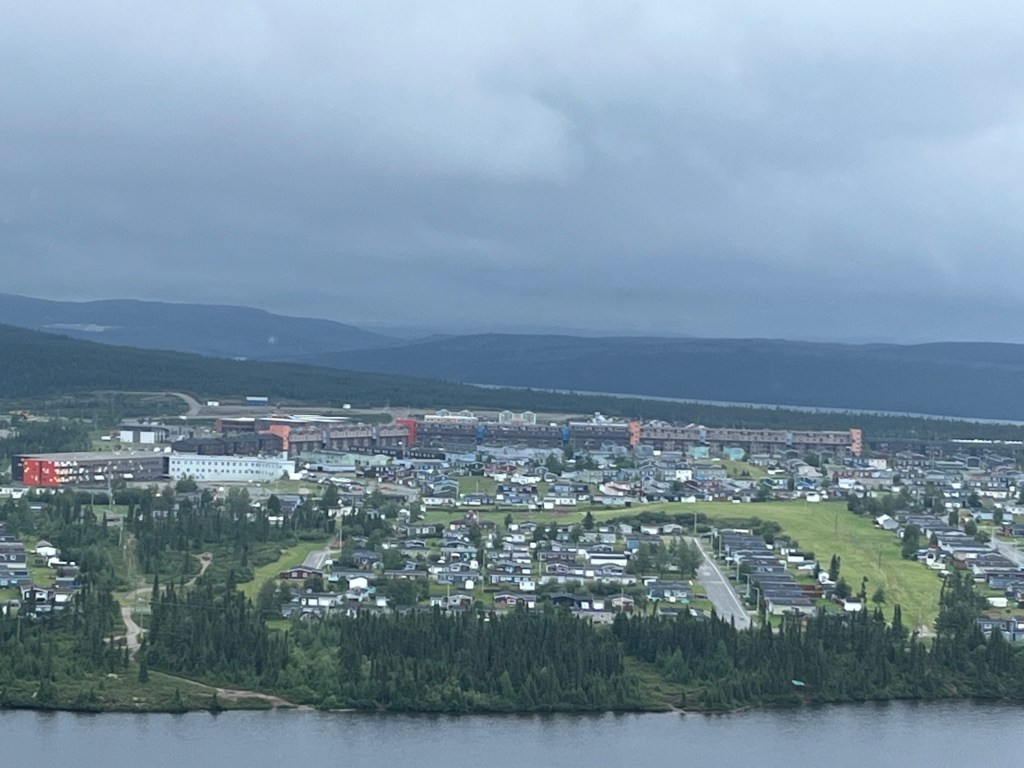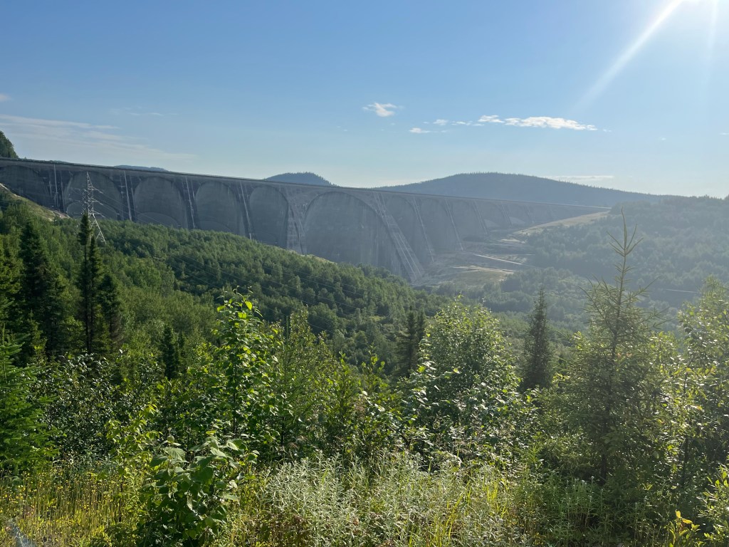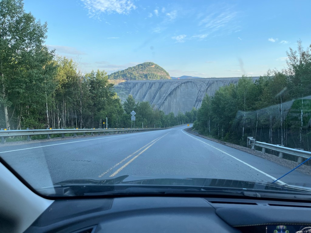 28. Voici la vue … que je ne vois pas au camping où je me suis installé (à Grandes-Bergeronnes) … pour la dernière nuit de ma virée de deux mois.27. Manic-5 dans toute sa largeur. À droite de la grande arche, la route en zigzag qui mène à Fermont. Et vice-versa !26. Arrivée à Manic-5. Tel que constaté avec Copine il y a quelques années : Cé gros en ti-minou !25. Camping sur les rives du réservoir Manicouagan. Chouette !24. Snif ! Ma belle roulotte blanche. Voilà ce que donne des km de route 389 en terre battue. Pi mon char est pu bleu 🥲23. Dodo à la Station Uapishka. Ça c’est le menu du souper d’hier. Merde ! J’ai manqué les pleurotes. Ce soir : truite. Ça va pas être mauvais non plus 😛.22. Fin d’après-midi sur le réservoir Manicouagan (qui alimente les centrales hydro-électriques Manic).21. Rivière Hart-Jaune. Tantôt j’ai aussi croisé la rivière Manicouagan. En version amont des centrales Manic.20. Voici tout ce qu’il reste de l’ex-ville minière de Gagnon. Un terre-plein central et des chaînes de trottoirs dotées de margelles pour les entrées de garages.19. La route 389 est comme ça. Bordée de lacs et de forêts éparses sur tapis de lichens. J’aime.18. Situé à 800 mètres du Mur, le camping de Fermont (à 800 mètres) est occupé à 99% par des résidents de Fermont (à 800 mètres) qui aiment bien l’idée de quitter la moiteur étouffante de la ville (à 800 mètres) pour l’air pur de la campagne (à 800 mètres). « Hé Poussin ! Après souper, ça te dirait de prendre une marche jusqu’au chalet ? Ça nous ferait du bien de sortir de la ville ».17. Fermont vue du mont Daviault. A l’extrême gauche du Mur, l’hôpital. Fait cocasse : À Fermont, tous les croisements de rues sont en forme de T. Il n’y a aucun +. Cela afin de limiter le potentiel de collisions.16. Le Mur de Fermont c’est la structure en V qui protège la ville des vents cataba… cabata… frettes du grand Nord.15. « Geu ! Je peux jouer moi aussi ? ». Signé : Bof qui bave un peu 😁.14. À Fermont, tout est dans le Mur; ce monumental bâtiment de 1,3 km sur 3 à 5 étages. Piscine avec glissades d’eau, aréna, salle de quille, école, hôpital, épicerie, SAQ, pharmacie, agence de voyages, Rona, hôtel, etc. Il y a même deux restos. Les deux seuls de la ville. Ouverts seulement à partir de 15h pour cause de manque de personnel. Si Bof veut déjeuner ? Il y a le dépanneur … dans le mur.